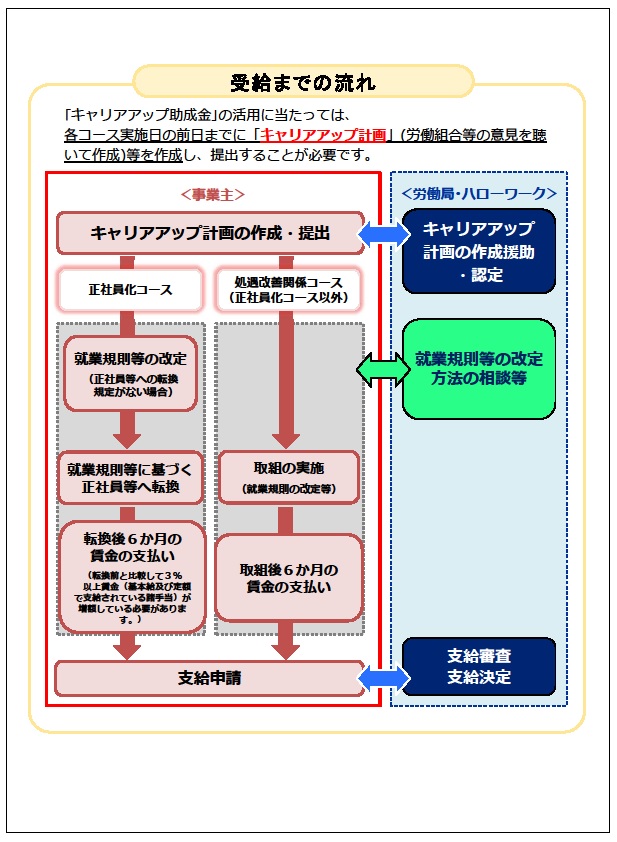 受給するためには、【受給までの流れ】の通り事前に計画書を作成し労働局から認定を受けたり、就業規則にこの制度を導入し社内制度の整備が必要となりますので、詳しい内容は当組合の事業者担当者宛にご連絡下さい。