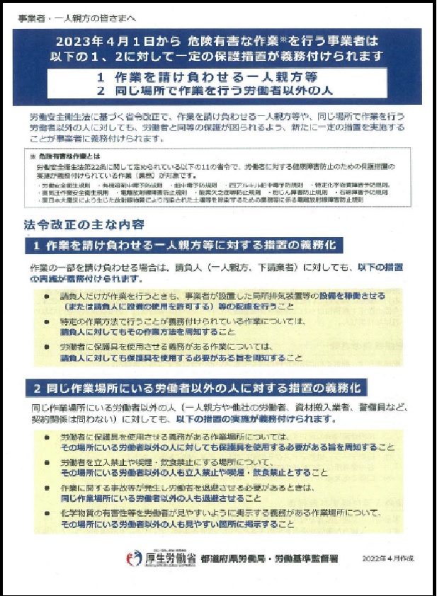 お知らせ 2022.05.12 労働安全衛生法が改正になります 2023年4月1日から危険有害な作業を行う事業者は一定の保護措置が義務付けられます。 詳しくは画像をクリック↓ クリックするとPDFが開きます。