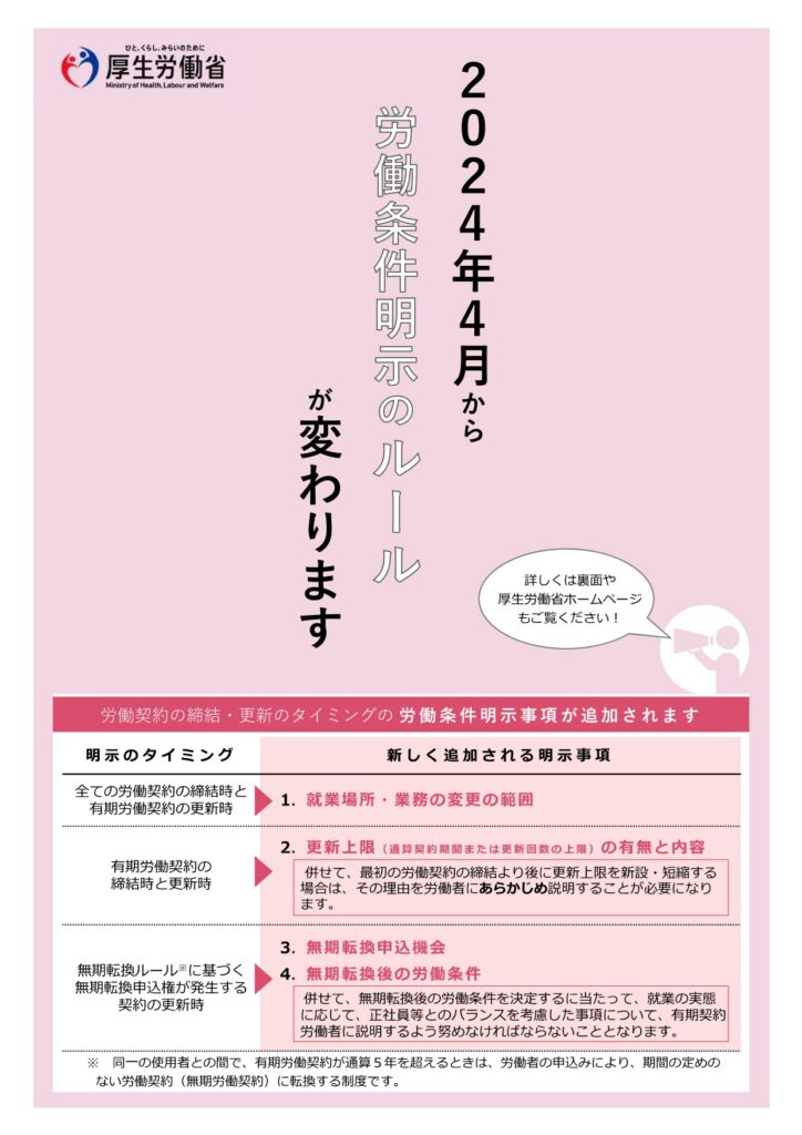 お知らせ 2024.07.24 労働条件明示ルールが変更になっています 労働契約の締結・更新のタイミングの労働条件明示事項が追加されています詳しくは厚生労働省発行のパンフレットをご覧ください。 ↓クリックするとPDFが開きます