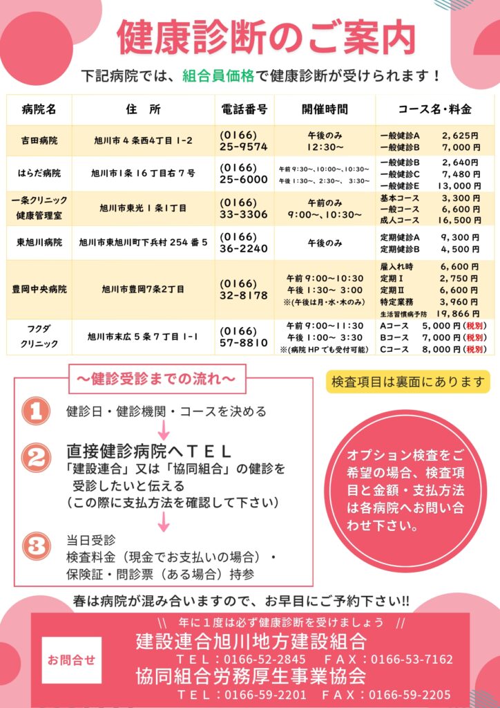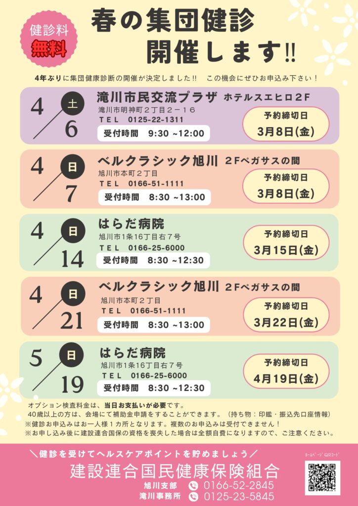 お知らせ 2024.02.21 春の集団健診開催します!! お待たせしました!! 4年ぶりに集団健康診断の開催です♪ 健診料無料です。 4月6日、7日の健診は3月8日(金)が予約締切です。 ご予約はお早めに!! 健診を受けると、PepUpポイントが500ポイント付きます。※PepUpポイントについては、1月26日のお知らせをご覧ください。 画像をクリックすると、PDFが開きます。 ↓ ◎国保組合員様以外で健診を受けられたい方は、 お得な組合員価格で健診受診できます。 画像をクリックすると、PDFが開きます。 ↓
