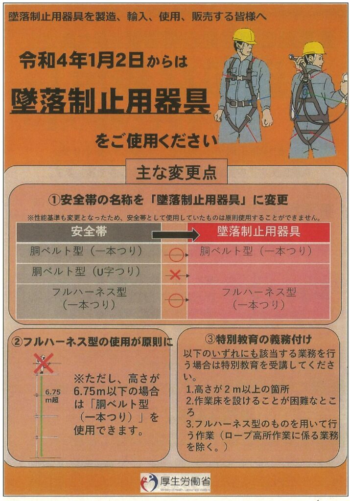 お知らせ 2022.03.24 適切な表示の墜落防止用器具をご使用下さい! 墜落制止用器具の規格については令和4年1月1日をもって経過措置期間が終了し令和4年1月2日よりフルハーネス型の使用が原則となりました。性能基準も変更となったため、今まで安全帯として使用していたものは原則使用することができません。詳しくは画像をクリック ↓↓ 画像をクリックするとPDFが開きます。