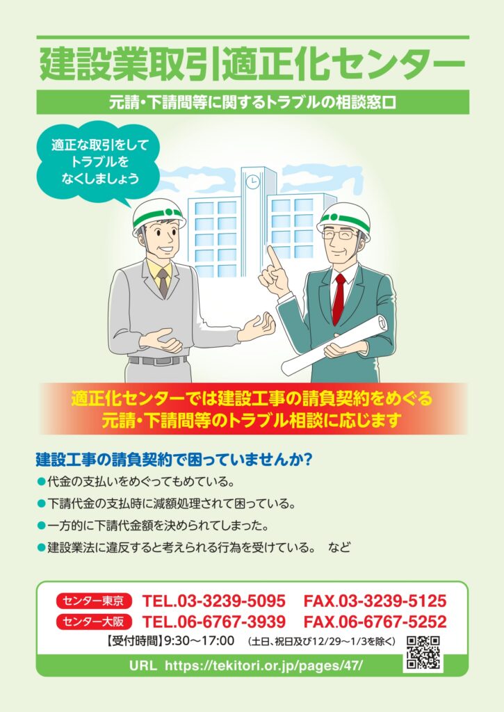 お知らせ 2023.04.17 建設工事の請負契約で困っていませんか? 建設工事の請負契約で困っていませんか? ●代金の支払いをめぐってもめている●下請代金の支払い時に減額処理されて困っている●一方的に下請代金額をきめられてしまった●建設業法に違反すると考えられる行為を受けている など 公共財団法人 建設業適正取引推進機構では、建設工事の請負契約をめぐる元請・下請間等のトラブルの相談に応じています。相談業務の内容・相談方法等、くわしくはリーフレットをご覧ください。 ↓クリックするとPDFが開きます。