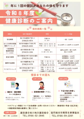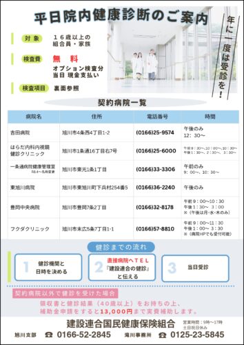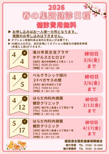お知らせ 2026.03.04 春の集団健診を開催します! 組合員様へ 令和8年度集団健診を開催します。 国保組合員様以外の方で、健診をご希望の方は 最下部のご案内をご覧ください。 ▼日曜日ご希望の方はこちら ▼平日健診ご希望の方はこちら ▼国保組合員様以外で健診をご希望の方はこちら