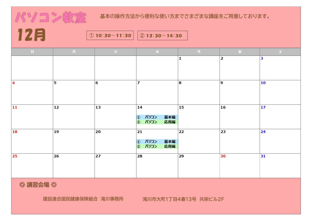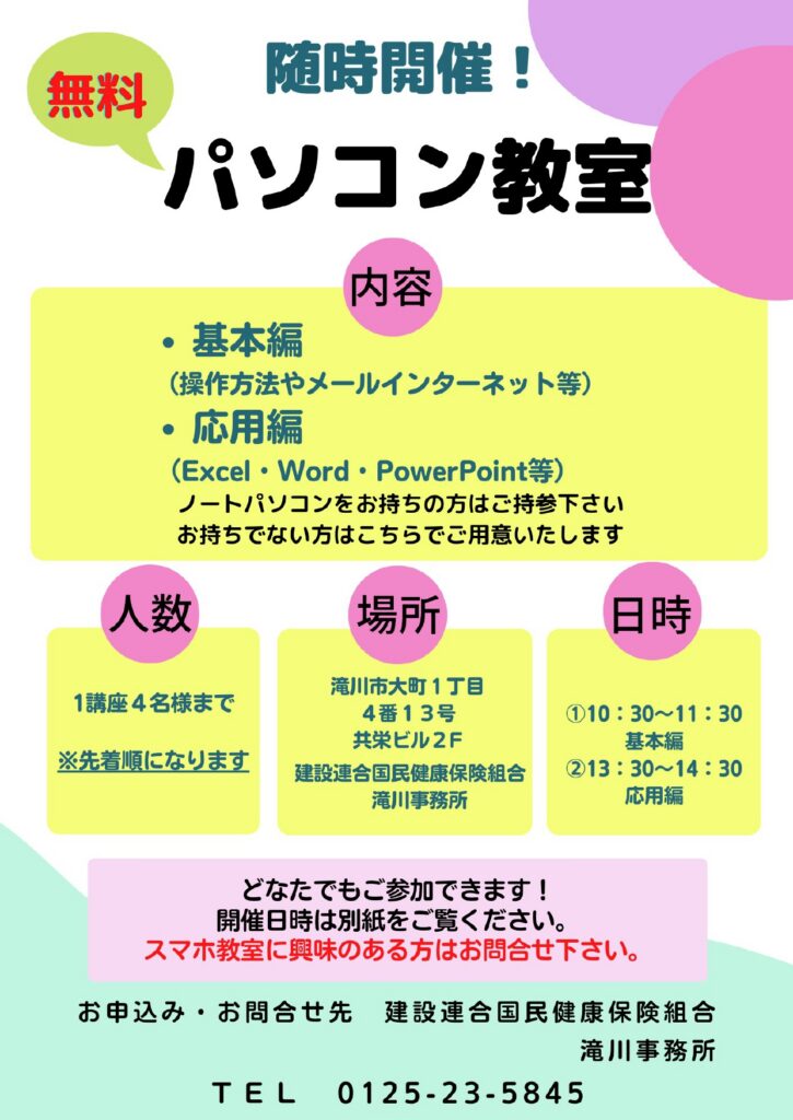 滝川事務所にて参加無料のパソコン教室が開催決定しました。
