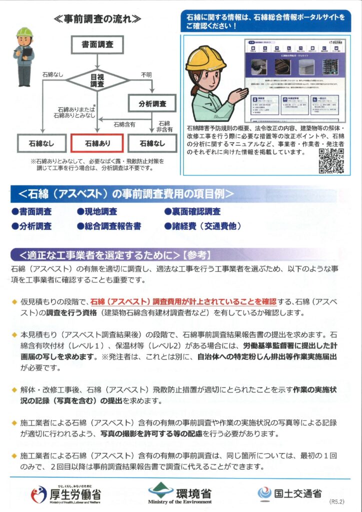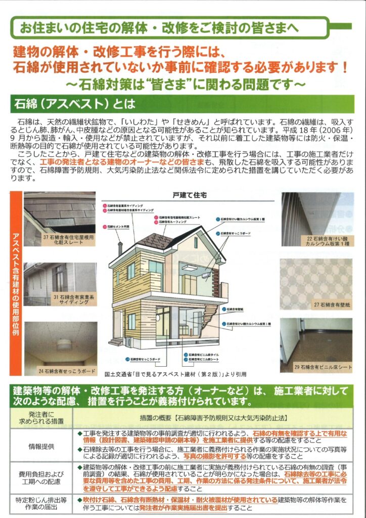 お知らせ 2023.03.03 石綿対策は皆さまに関わる問題です 建築物等の解体・改修工事においては施工業者に作業に従事する者の石綿粉じんによるばく露防止対策の措置が義務付けられています。建物の解体・改修工事を行う際は石綿が使用されていないか事前に確認する必要があります。工事の発注者となる建物のオーナーなどの皆様も飛散した石綿を吸入する可能性がありますので関係法令に定められた措置をしていただく必要があります。 ↓詳しくは画像をクリック