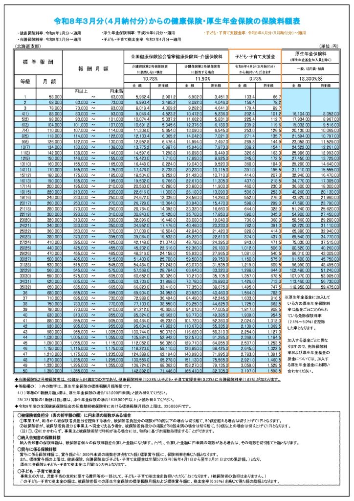 お知らせ 2026.03.04 社会保険料率が変更になりました 全国健康保険協会(協会けんぽ)では、令和8年3月分より 健康保険料率及び介護保険料率が変更になります。 また、令和8年4月から新たに創設される「子ども・子育て 支援金」により、全体のご負担はわずかに増える見込みです。 詳しくは「保険料額表」をご覧ください。