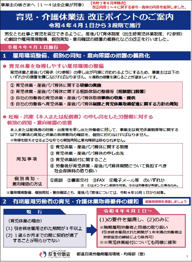 育児・介護休業法が令和4年4月1日より段階的に改正されます。
