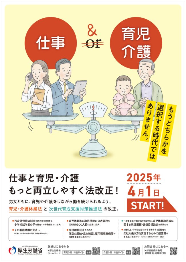 お知らせ 2025.08.22 10月1日から施行されます 10月1日から、育児介護休業法が改正施行されます。 今回は育児関係です。育児や介護に携わる人が休みやすくする、 働きやすくするための法律です。 ご確認ください。 ↓詳細は画像クリック↓