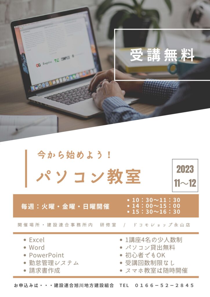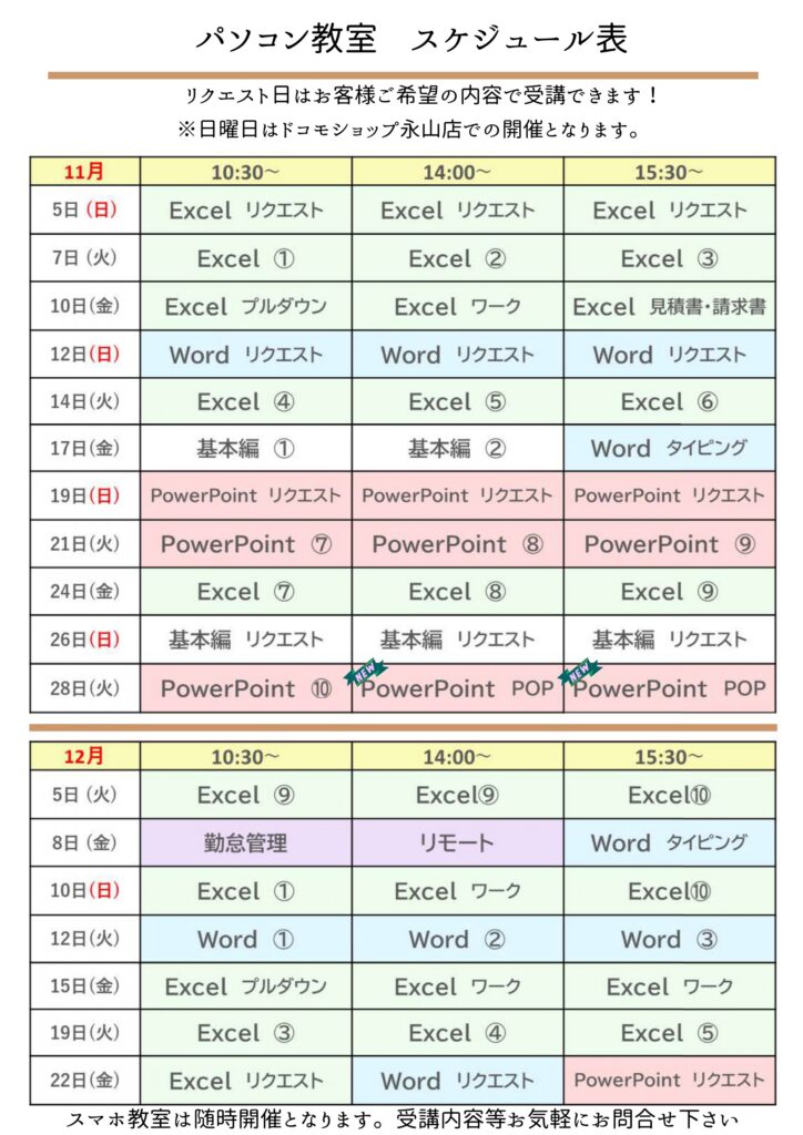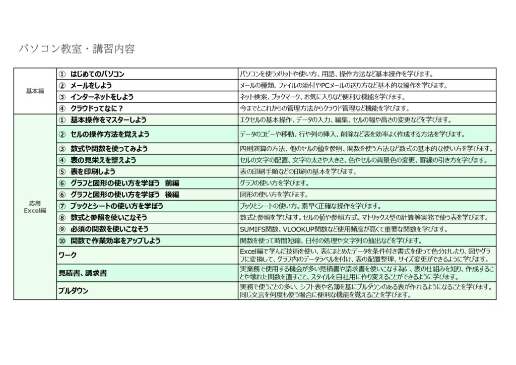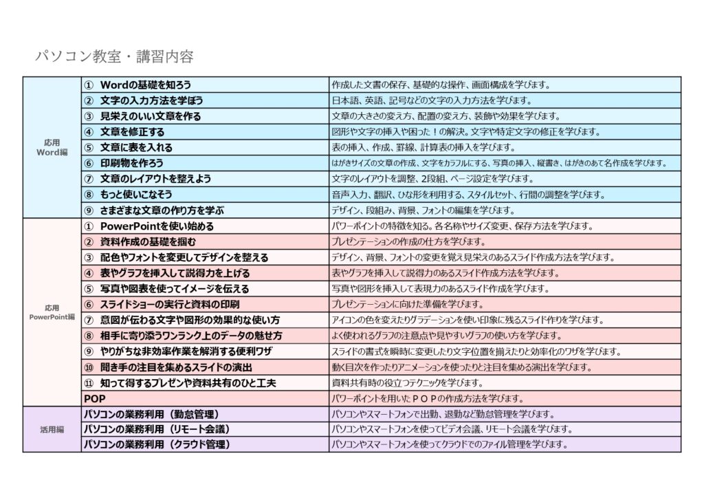 お知らせ 2023.10.24 11月~12月パソコン教室スケジュールが決定しました! 大好評いただいておりますパソコン教室の11月12月スケジュールが決定いたしました。パソコンの基礎からタイピング、請求書作成等ご自身のレベルに合わせた受講が可能です。1講座4名様までとなっておりますので、ご予約はお早めに! 11月~12月スケジュール表・カリキュラムはこちら↓画像をクリックするとPDFが開きます。