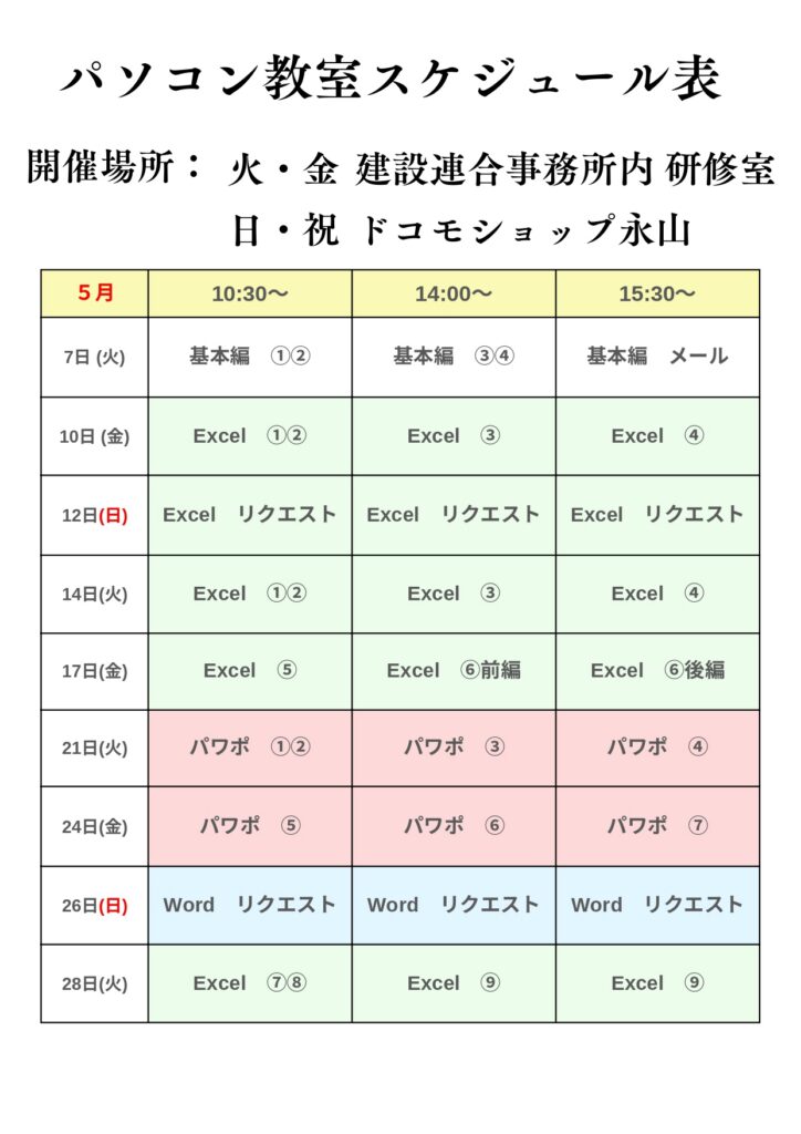 大好評いただいておりますパソコン教室5月のスケジュールが