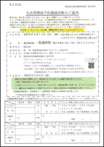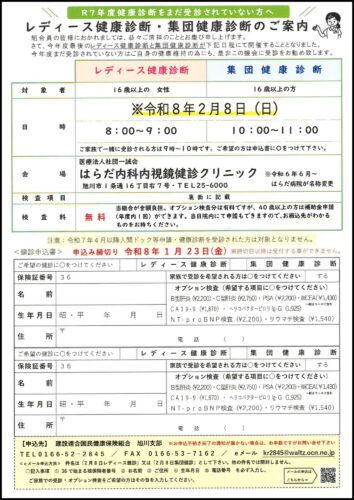国保組合員様へ 2025.12.24 【無料】レディース健診・集団健診を開催します 「最近、健診を受けていないな……」 そう思いながら、忙しい毎日を過ごしていませんか? ご自身の体と向き合うきっかけとして、日曜開催・費用無料の健診を実施いたします。お休みの日を利用して、身近な会場で健康チェックをしましょう。 ここがポイント! 受診料は無料: 自己負担なしで受診いただけます。 日曜開催: 平日はお仕事や家事で忙しい方も安心です。 旭川市内2会場: お近くの会場をお選びいただけます。