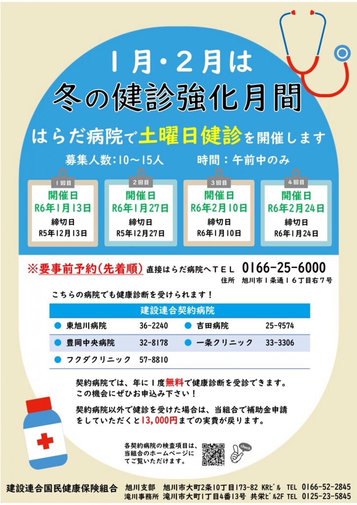 国保組合員様へ 2023.12.07 土曜日健診開催します! 1月、2月はらだ病院で土曜日健診を開催します。要事前予約で先着順です。 先着順ですので、ご予約はお早めに! 詳細は下記をご覧ください。 画像をクリックすると、PDFが開きます。 ↓