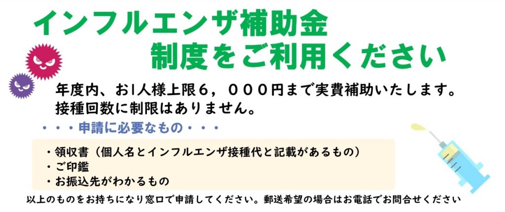 予防接種を受けた際は、補助金申請が出来ますのでご活用ください。
