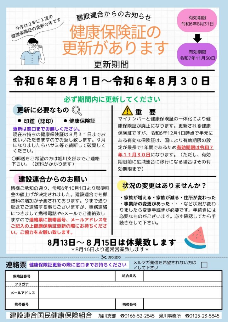 9月1日から使用できる保険証の更新です。必ず期間内に更新してください。